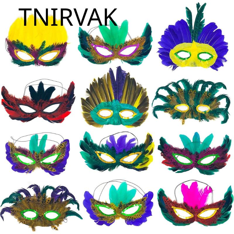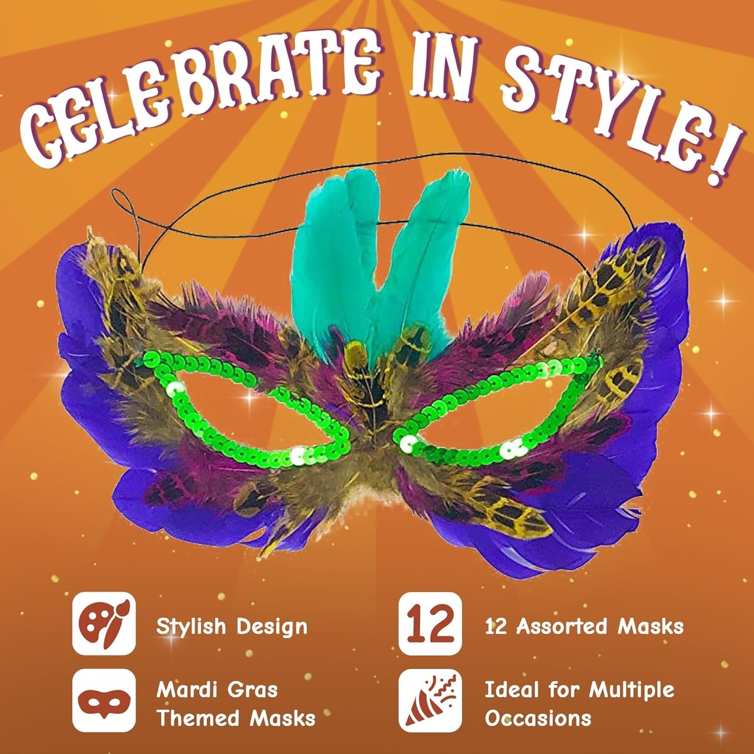 - COLORFUL FEATHERED ELEGANCE: Podzly's 12 Assorted Mardi Gras Masks with Feathers feature deep purples, emerald greens, royal blues, and vivid golds. These elegant Venetian-style masks ensure you stand out at parties, proms, and ballroom events, embodying the essence of antifaz para fiestas elegante.