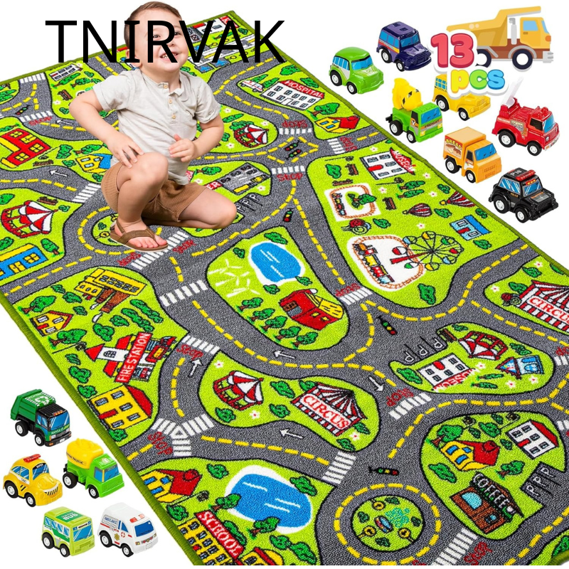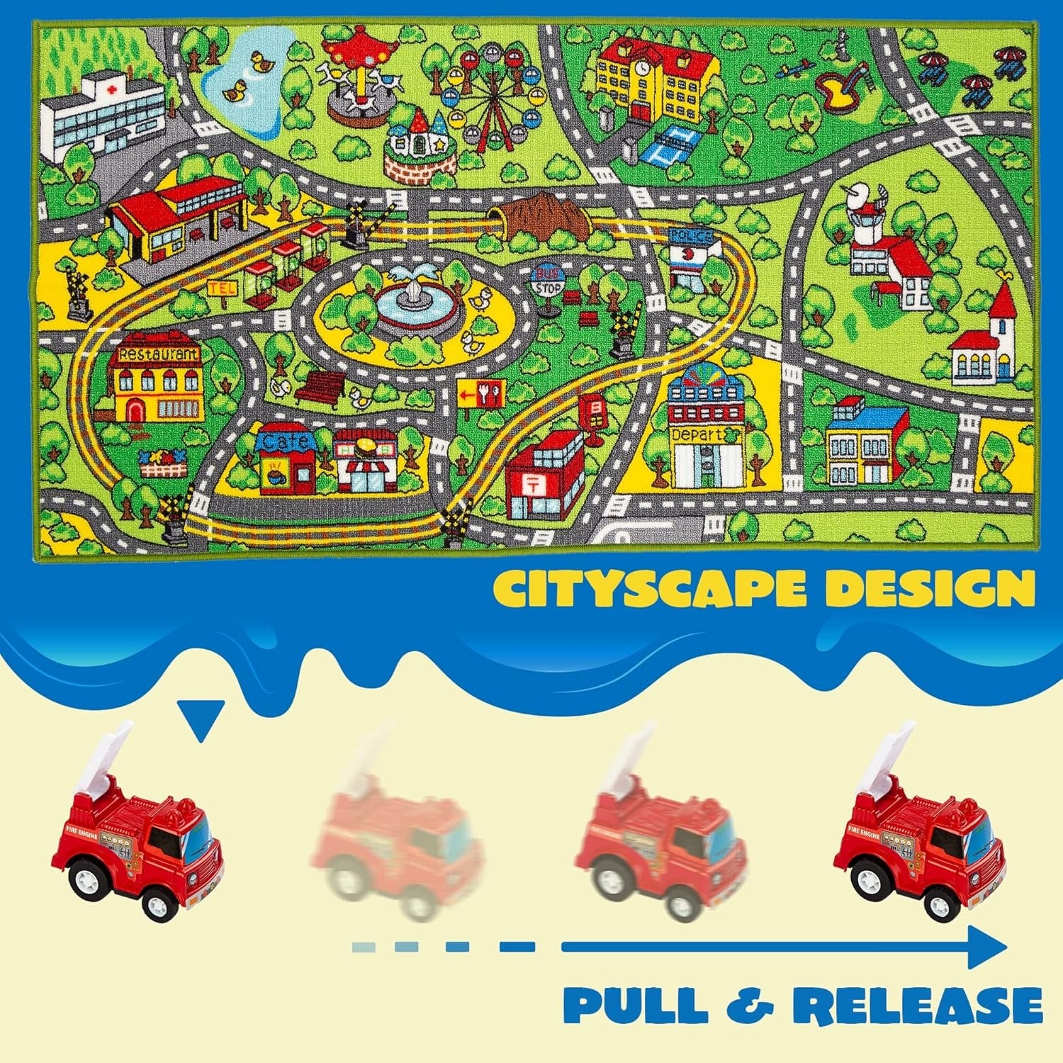 TNIRVAK Kids Play Rugs - 12 Pull-Back Vehicle Set - Durable Carpet Playmat Rug - City Pretend Play - Toddler Car Track Rug